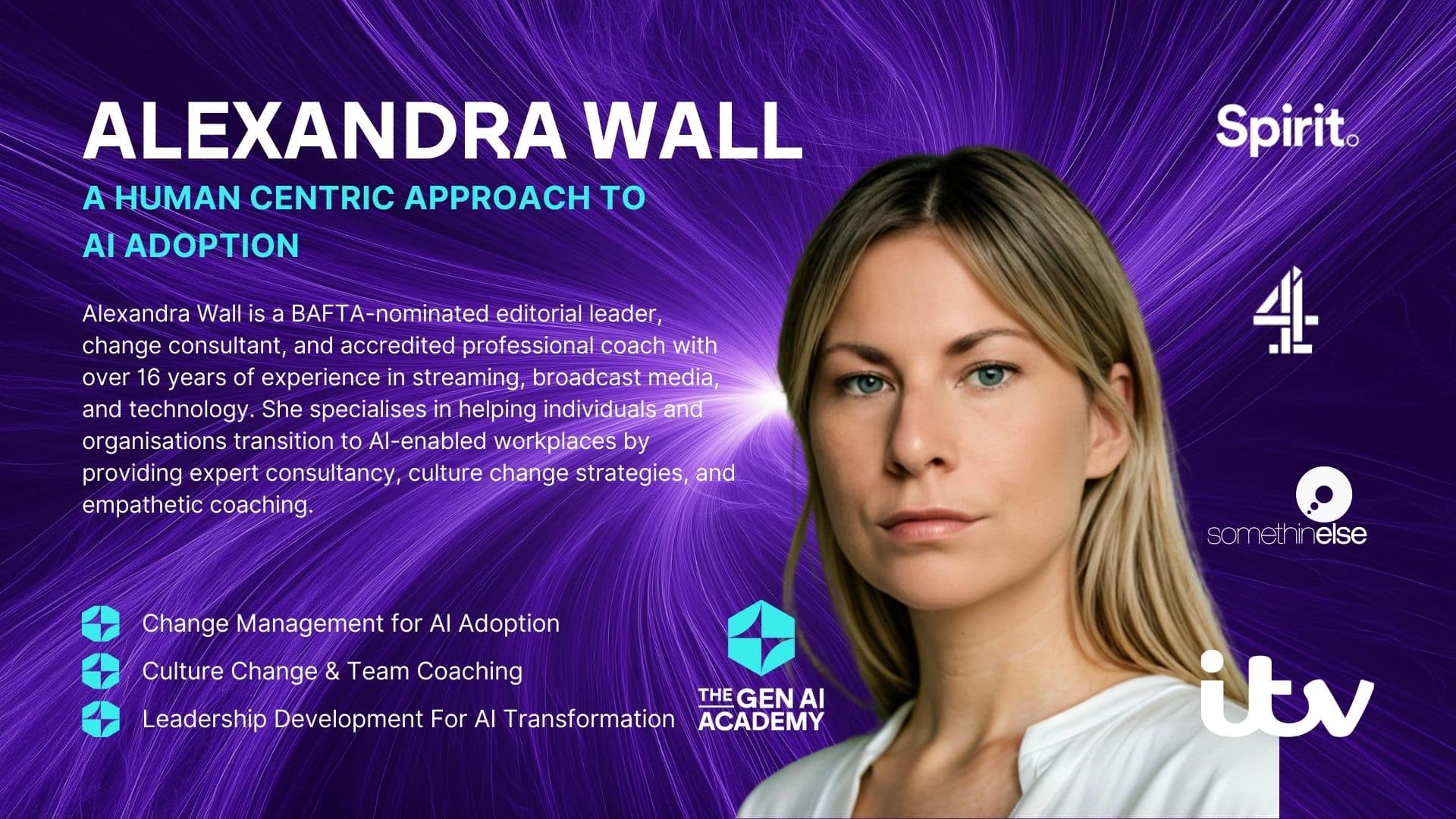 Alex Wall es una líder editorial nominada a los premios BAFTA, consultora de cambio y coach profesional acreditada con más de 16 años de experiencia en streaming, medios de comunicación y tecnología. Se especializa en ayudar a personas y organizaciones a realizar la transición a lugares de trabajo habilitados para la IA, proporcionando consultoría experta, estrategias de cambio cultural y coaching empático.