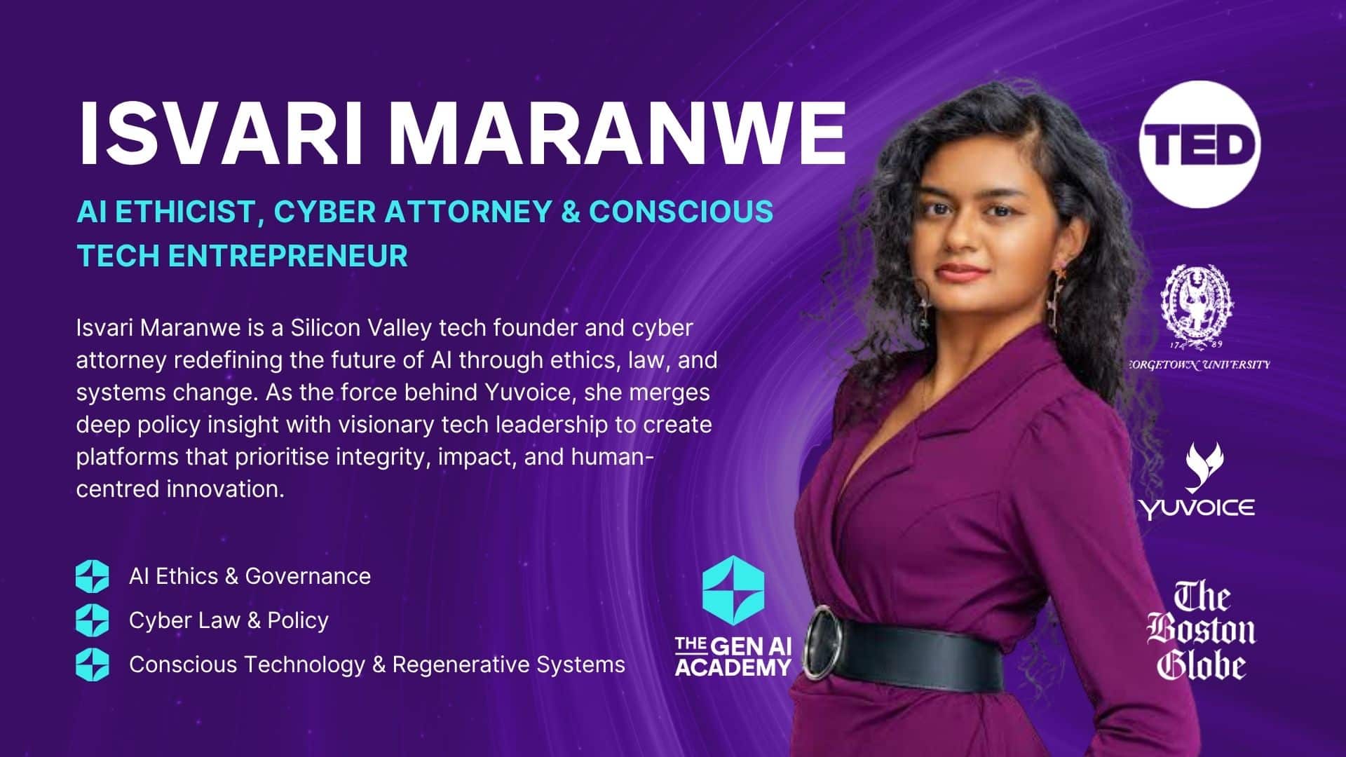 Isvari Maranwe es fundadora de una empresa tecnológica en Silicon Valley y abogada especializada en ciberseguridad formada en Washington D.C., con una voz distintiva en la encrucijada entre el derecho, las tecnologías emergentes y el diseño consciente de sistemas. Actualmente afincada en Londres, aporta una rara síntesis de experiencia jurídica, conocimiento de políticas y pensamiento a nivel de sistemas al debate global sobre la inteligencia artificial, la ética y la transformación colectiva.