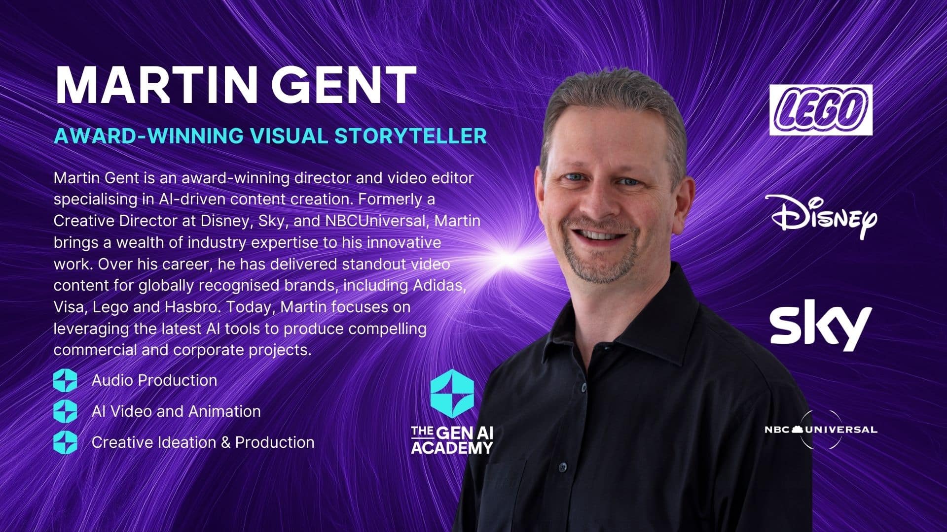 Martin Gent es un galardonado director y editor de vídeo especializado en la creación de contenidos impulsados por la inteligencia artificial. Antiguo director creativo de Disney, Sky y NBCUniversal, Martin aporta una gran experiencia en el sector a su innovador trabajo. A lo largo de su carrera, ha creado contenidos de vídeo destacados para marcas reconocidas a nivel mundial, como Adidas, Visa, Lego y Hasbro. En la actualidad, Martin se centra en aprovechar las últimas herramientas de inteligencia artificial para producir atractivos proyectos comerciales y corporativos.
