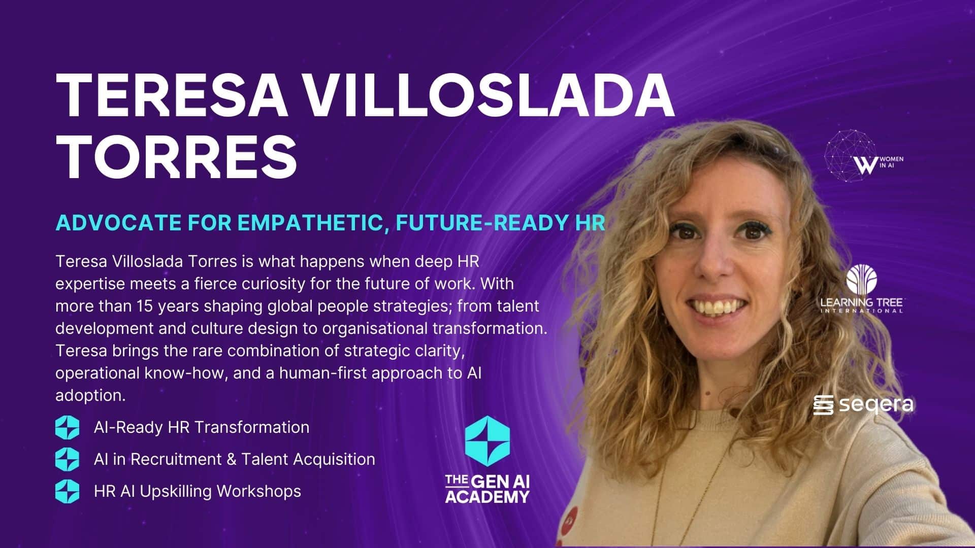 Teresa Villoslada Torres es el resultado de la combinación de una profunda experiencia en recursos humanos y una gran curiosidad por el futuro del trabajo. Con más de 10 años de experiencia en el sector tecnológico, Teresa ha contribuido al desarrollo del talento, el diseño de la cultura y la transformación organizativa. Teresa aporta una combinación poco común de claridad estratégica, conocimientos operativos y un enfoque centrado en las personas a la adopción de la inteligencia artificial.
